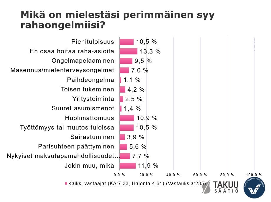 Takuusäätiö kysyi 285 henkilöltä mistä heidän rahaongelmansa loppujen lopuksi johtuvat. Jos asiaa arvuuttelisi puhtaasti median kirjoittelun pohjalta, olisi helppo tarjota syiksi pikavippejä, rahapelejä, pienituloisuutta, päihteitä tai riittämättömiä sosiaalitukia. Tätä mieltä eivät ole rahaongelmien parissa painivat ihmiset.